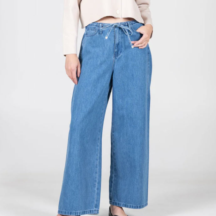 Pantalon à jambes larges en denim souple avec élastique à nouer sur le devant.