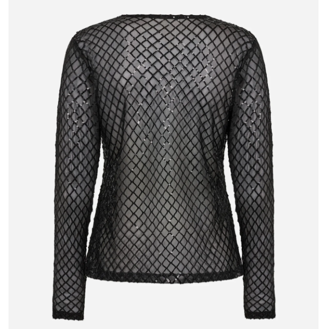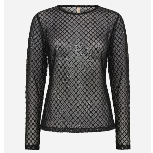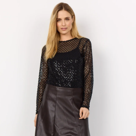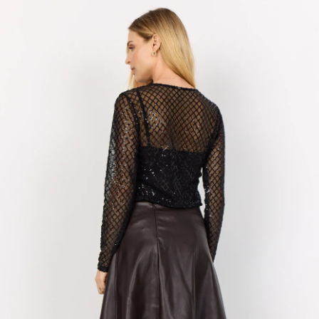 Le t-shirt SC-ASIMA 1 est composé à 95 % de polyester et à 5 % d’élasthanne. Il présente des manches longues avec une superposition en maille ornée de paillettes délicates, créant un motif quadrillé unique. Portez-le avec un pantalon élégant ou une jupe classique pour un look élégant.