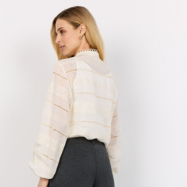 Ce chemisier élégant est orné de délicats détails en dentelle, d’un col montant et de manches longues confortables.