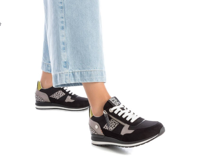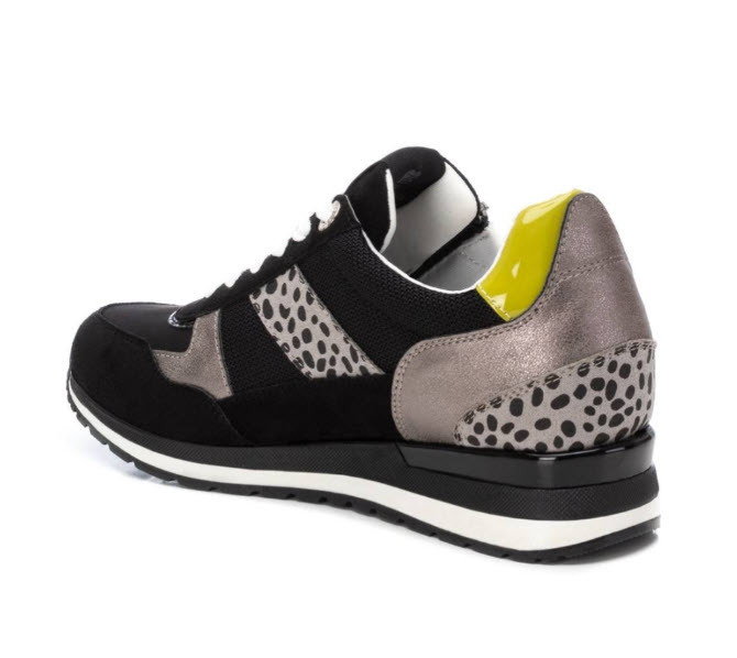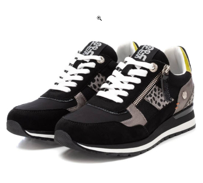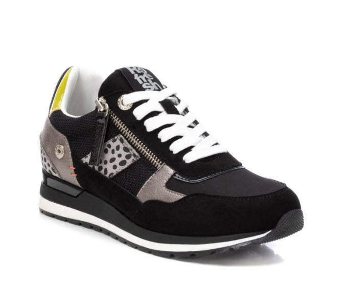 Chaussure de sport pour femme, marque Refresh. Fabriquées dans une matière imitant le cuir combinée à du tissu. Fermeture zippée sur le côté et lacets réglables. Imprimé animalier très tendance cette saison. Semelle en caoutchouc antidérapante et confortable. Ce modèle a été certifié végétalien par l’organisation mondiale PETA (organisation de défense des droits des animaux).