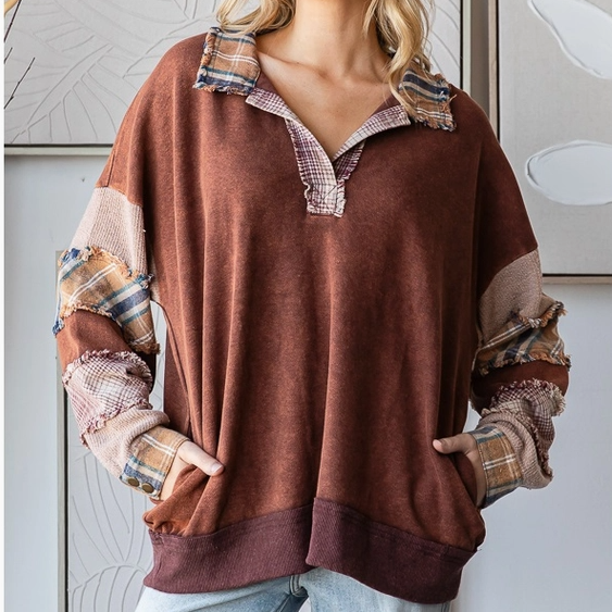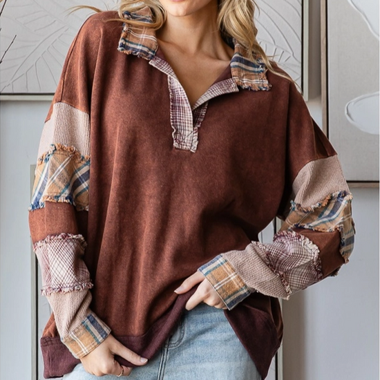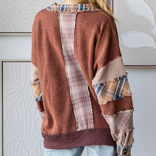 Haut Manches Longues Col V Patchwork Burgundy LSS270