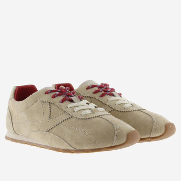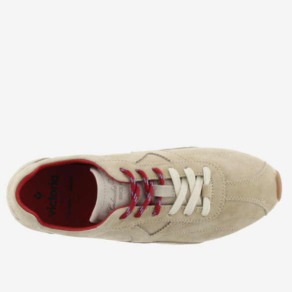 Sneakers pour femme fabriquées en daim. Logo de victoria gravé sur la pièce arrière et surpiqûres visibles. Fermeture par double lacet : un blanc et un coloré de type rond avec motif, assorti à la doublure intérieure. Semelle en caoutchouc avec patin cranté en EVA couleur caramel.