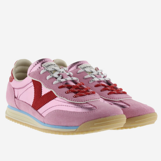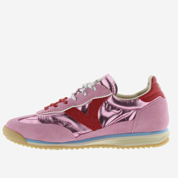 Sneakers pour femme fabriquées en nylon métallisé avec des empiècements superposés en daim. V latérale de victoria en contraste assortie à la pièce arrière. Fermeture par double lacet : tous deux ronds avec motif ton sur ton. Semelle bicolore en caoutchouc avec patin cranté en EVA couleur caramel.