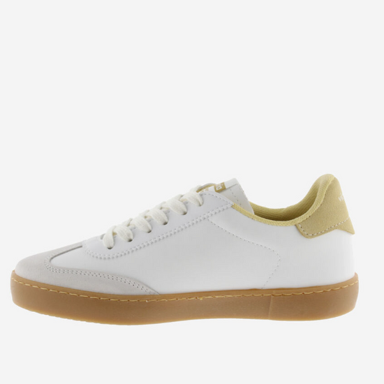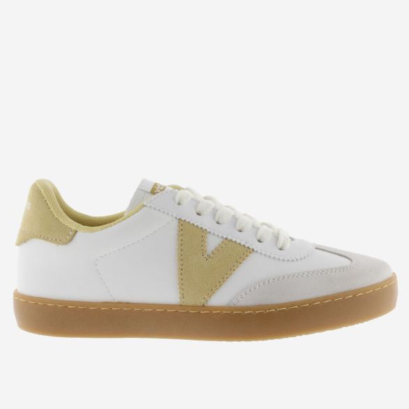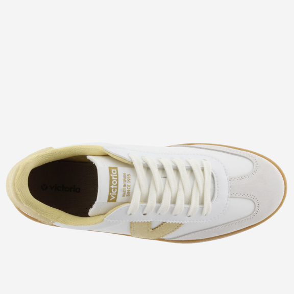 Baskets pour femme fabriquées en Espagne en effet cuir blanc avec pièces en cuir velours. V latérale de victoria, doublure et pièce arrière assorties en couleurs contrastantes. Semelle translucide en T.R. couleur caramel.