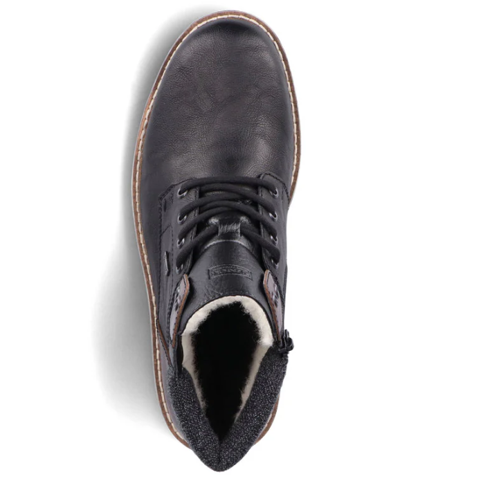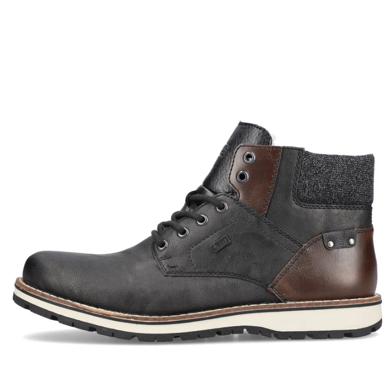 Difficile de faire plus confortable ! Gardez vos pieds bien au chaud avec ces élégantes bottines à lacets Rieker noires et marron. L'association astucieuse du laçage et de la fermeture éclair facilite l'enfilage et le retrait. Les détails marron apportent une finition parfaite et un look original. La semelle adhérente offre un maintien optimal à chaque pas. Autre atout : la semelle de propreté extra-douce. La largeur confort offre suffisamment d'espace pour que vos pieds soient à l'aise, même en cas de port prolongé. L'association de la membrane RiekerTEX déperlante et de la doublure en laine vierge douillette et très chaude vous assure des pieds au chaud et au sec par tous les temps. Alors, c'est parti !